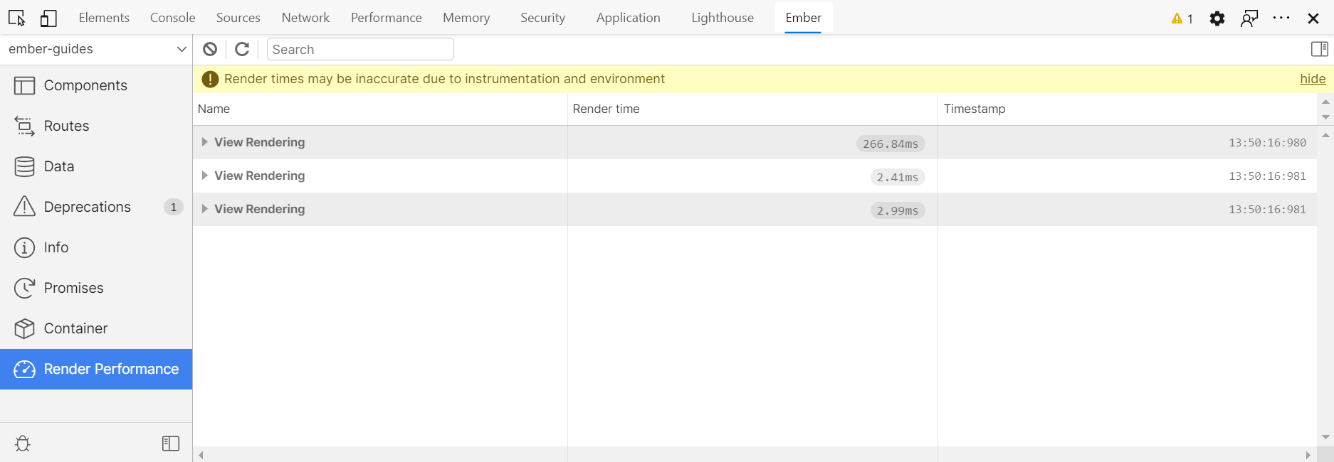 You can use the Inspector to measure your app's render times. Click on Render Performance to start inspecting render times.