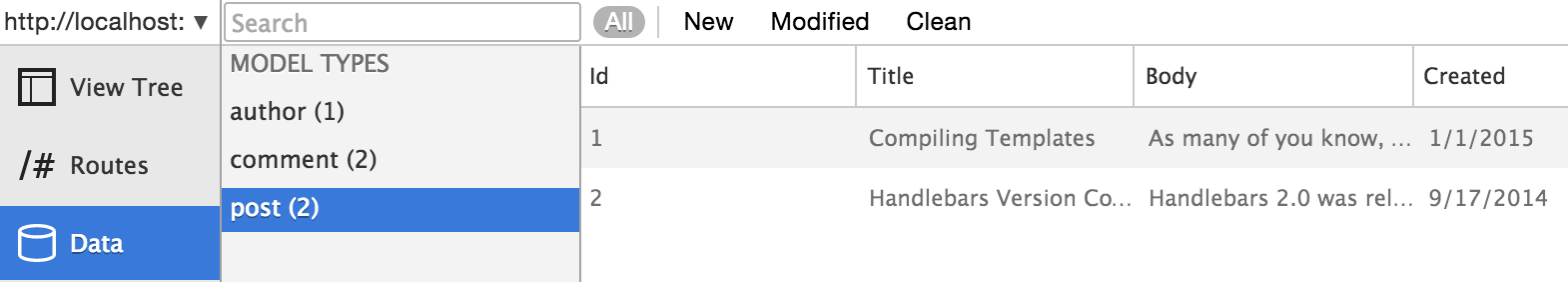 You can inspect your models by clicking on the Data tab. Check out Building a Data Custom Adapter below if you maintain your own persistence library. When you open the Data tab, you will see a list of model types defined